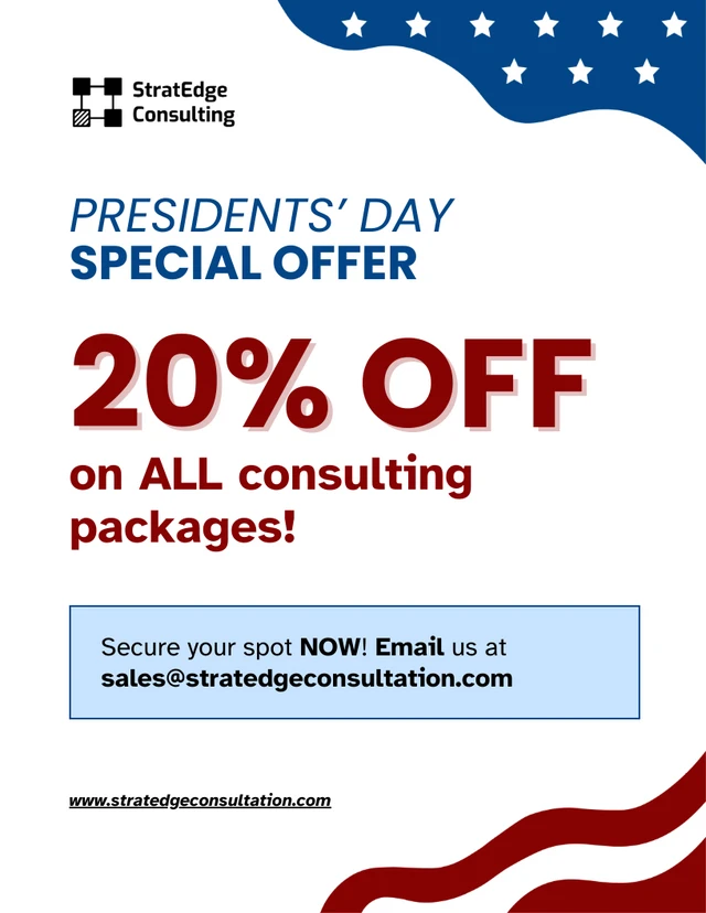 هل ترغب في إحداث ضجة في يوم الرؤساء هذا؟ قالب نشرة عروضنا الخاصة هنا لمساعدتك على جذب الانتباه وزيادة مبيعاتك! صُمم هذا القالب بإتقان، وهو مثالي للترويج لعروضك الحصرية ونشرها بسهولة. انغمس في عالم التخصيص كما لم تفعل من قبل - ببضع نقرات، أضف لمسة لونية، وعدّل الأحجام، واختر الصور أو الرموز المثالية من مكتبة الصور المجانية الغنية لدى Venngage. سواء كنت تُقيم فعالية تخفيضات كبيرة أو خصمًا بسيطًا داخل المتجر، صُممت هذه النشرة لتلبية احتياجاتك الترويجية بسلاسة. حوّل رؤيتك الإبداعية إلى واقع، واجذب انتباه جمهورك بنشرة مذهلة ومخصصة، واجعل يوم الرؤساء يومًا مميزًا لعملك!