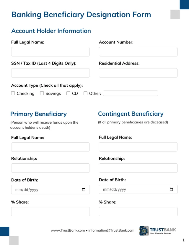 هل تبحث عن طريقة سلسة لإدارة معلومات المستفيدين؟ قد يكون نموذج استمارة المستفيدين لدينا هو ما تحتاجه. صُمم هذا النموذج خصيصًا ليكون واضحًا وسهل الاستخدام، وهو مثالي لضمان تسجيل جميع بياناتك الأساسية بكفاءة. يتضمن النموذج أقسامًا للبيانات الشخصية، ومعلومات الاتصال، وتخصيصات المستفيدين، مما يضمن عدم إغفال أي معلومة مهمة. إنه مزيج مثالي بين التصميم الاحترافي والتفاعل سهل الاستخدام. هل تحتاج إلى تعديله ليناسب احتياجاتك بشكل أفضل؟ لا مشكلة! هذا النموذج هو التصميم الأمثل للترويج ونشر المعلومات. يمكنك تخصيصه كما تشاء - إضافة ألوان، وتغيير الأحجام، واختيار أفضل الصور أو الرموز من مكتبات الصور المجانية لدينا لإنشاء تصميمك المثالي في Venngage.